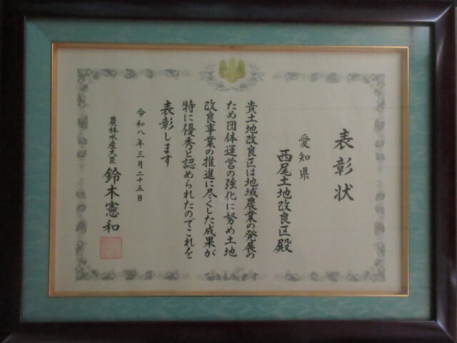 当土地改良区の功績が認められ令和8年3月25日の第67回全国土地改良功労者等表彰において農林水産大臣表彰を受賞いたしました。