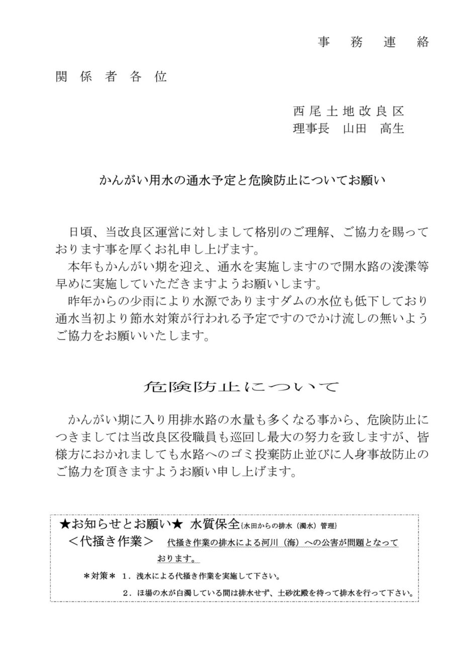 かんがい用水の通水予定と危険防止についてお願い